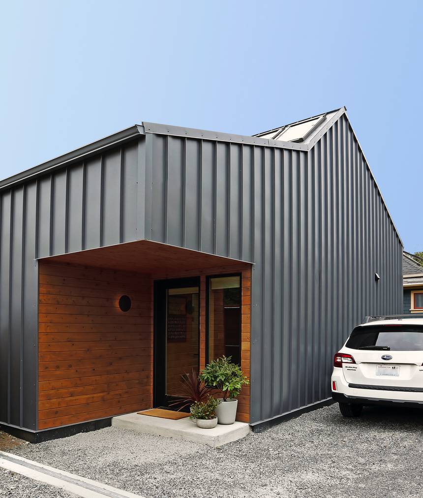 L’extérieur est revêtu d’un simple métal à joint debout, sans entretien et sans beaucoup de fenêtres. L’objectif : préserver l’intimité des personnes qui vivent ici et de celles qui vivent dans la maison principale.
