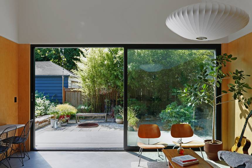 La seule grande ouverture au niveau du sol est une porte coulissante géante qui donne sur le jardin sur le côté ; avoir un grand terrain comme celui-ci aide certainement.