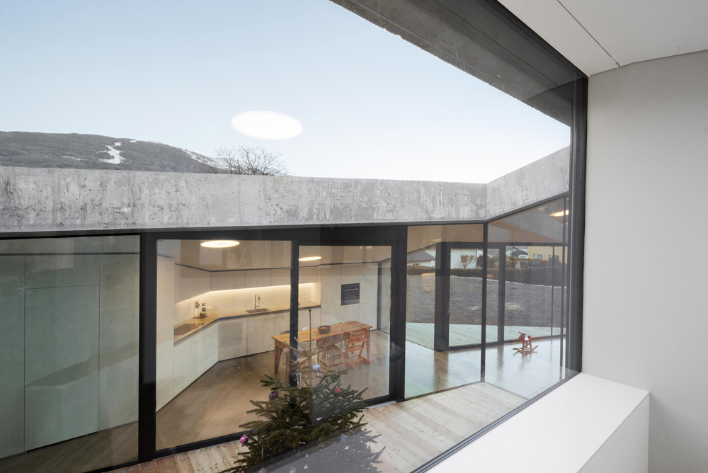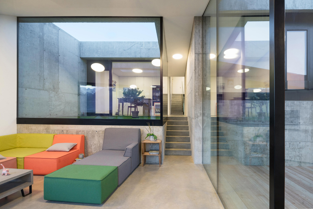 L’entrée est logée sous un auvent cantilever qui se déploie d’un coin au point le plus élevé du bâtiment. Une fois à l’intérieur, les espaces de vie s’étendent le long de la pente et sont disposés autour de trois patios en plein air. Les espaces extérieurs sont garnis de verre pour permettre à la lumière naturelle de se diffuser dans les pièces environnantes. La transparence des surfaces vitrées contraste avec l’extérieur du béton lourd de la maison et fournit aussi une connexion visuelle entre les espaces internes.