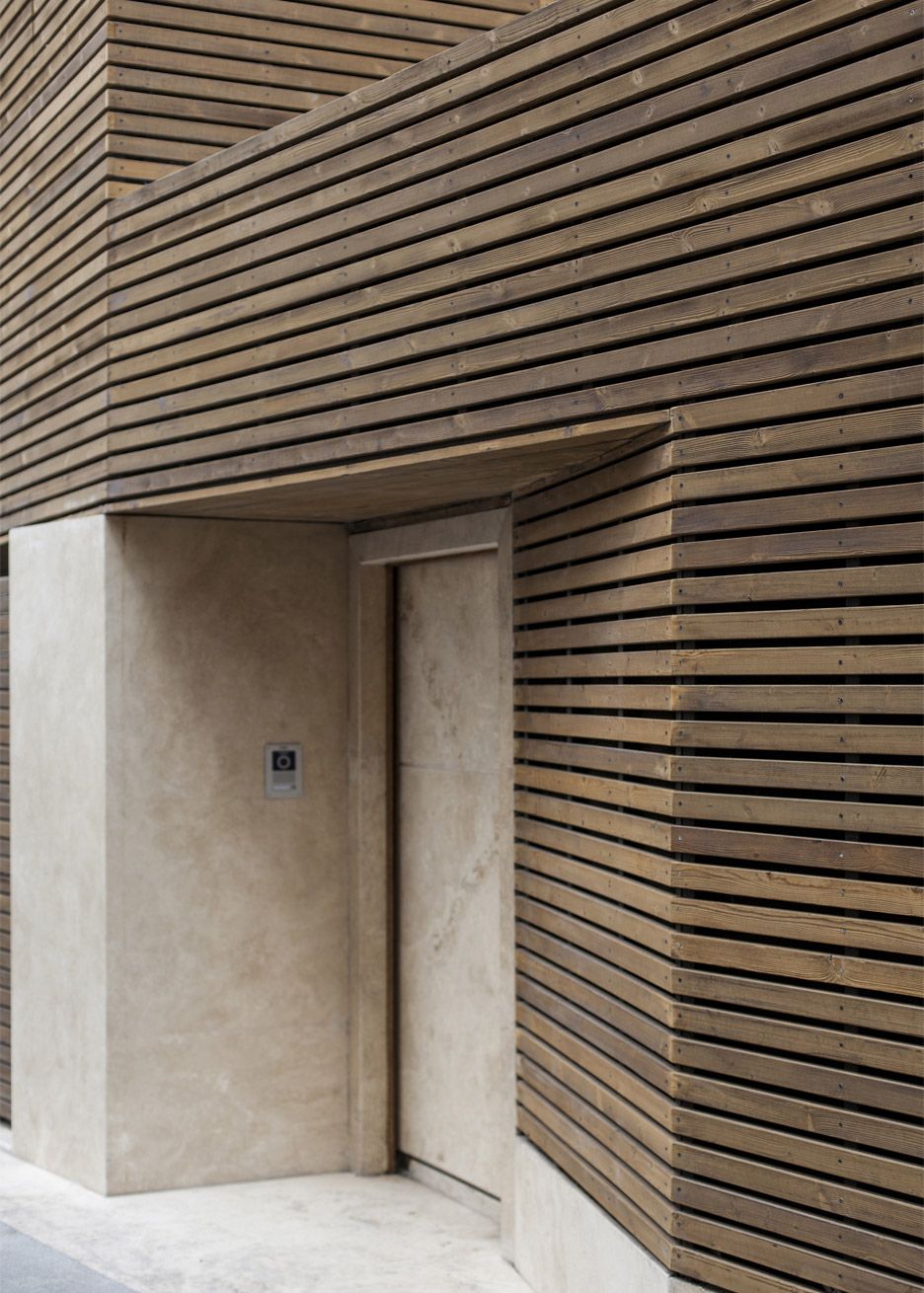 En plus de cet écran de bois, l’extérieur est également construit avec de la pierre de travertin de couleur crème qui rappelle un peu l’architecture du quartier. Même en étant hyper originale, cette maison s’intègre donc parfaitement dans son environnement.
