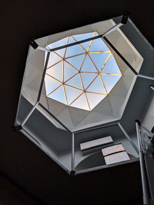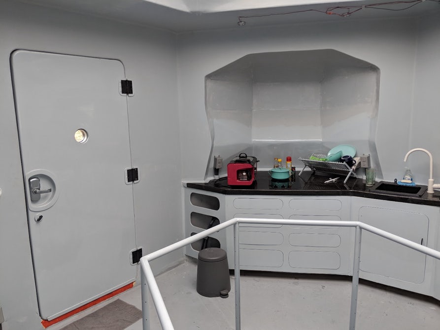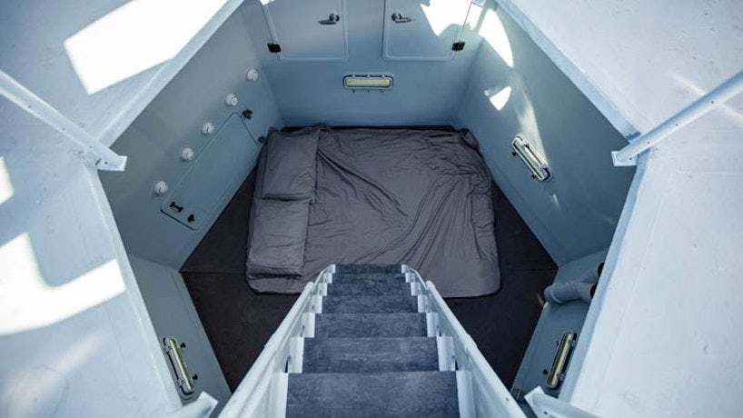 L’accès à la maison se fait via un escalier. Une fois à l’intérieur, les visiteurs sont accueillis par un intérieur étonnamment confortable qui mesure environ 22 mètres carrés et qui est surmonté d’un puits de lumière de style dôme. L’intérieur comprend une salle à manger, une kitchenette, une salle de bains, une petite terrasse extérieure et de nombreuses zones de rangement. Des escaliers mènent à des chambres à l’étage inférieur.