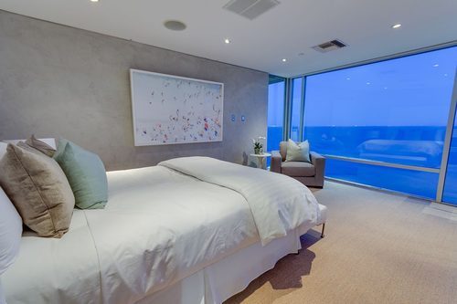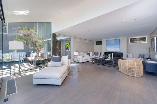 Au premier niveau, la maison propose un salon et une cuisine ouverte sur les nombreuses terrasses de la maison et sur une piscine tout en longueur grâce à des parois coulissantes en verre qui couvrent la totalité du mur. A l’étage, une aile plus privée abrite une suite chambre de maître. La maison propose aussi une salle de jeux, un home cinéma, et un jardin de méditation.