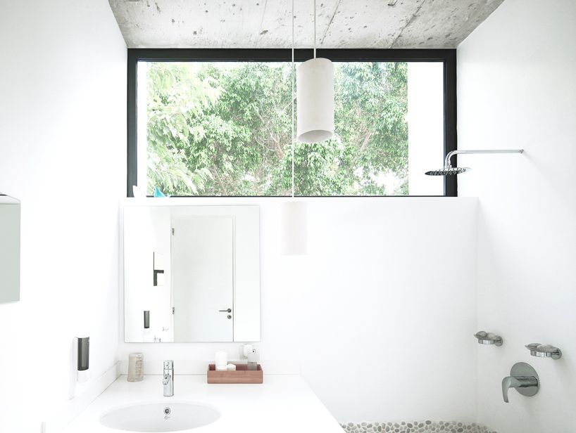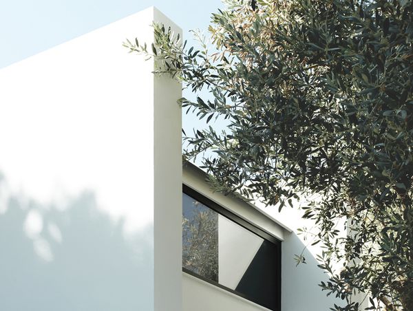 De nombreuses fenêtres-véranda, pleine hauteur permettent d’inonder la maison de lumière naturelle. Exactement ce qu’il faut pour ce type de climat méditerranéen ensoleillé. En parallèle, les sols en béton clair et le plafond, ainsi que le placement stratégique des arbres environnants permettent de faire entrer et refléter un maximum de lumières.