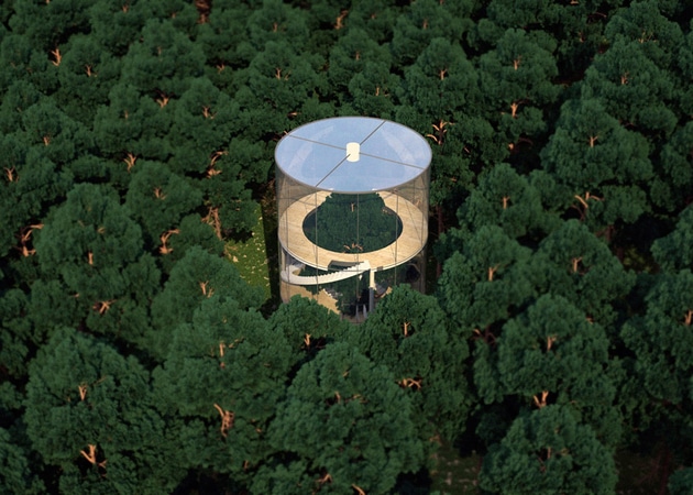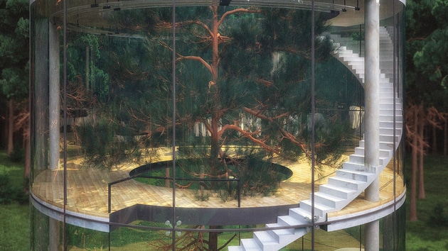 Conçue comme une cabane inversée, sa structure entièrement vitrée et cylindrique offre une vision à 360 degrés. S’élevant sur quatre étages reliés par un escalier en colimaçon qui s’enroule autour du tronc d’arbre, cette maison se veut totalement connectée avec la nature. Elle place l’arbre et toutes ses symboliques au centre de l’espace de vie. D’ailleurs, l’architecte a voulu offrir une alternative à la vie en ville. L’architecte Kazakh Aibek Almassov compare le fait de monter l’escalier, pour accéder aux différents étages, à une illumination spirituelle.