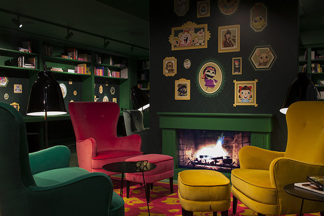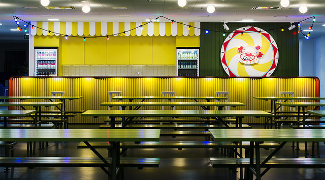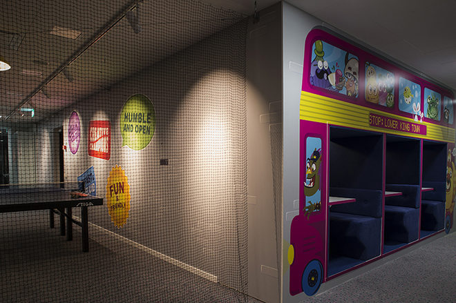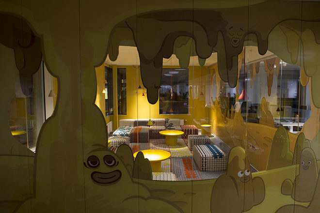 Adolfsson & Partners qui s’est occupé du design intérieur s’est certes inspiré de Candy Crush mais également des 200 autres jeux de King. Résultat : des murs recouverts de dessins de monstres, des espaces de jeu, des balançoires, des lits trampolines, etc. Regardez :