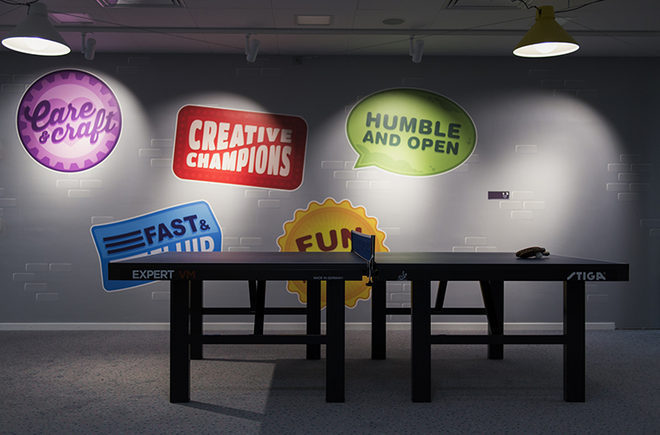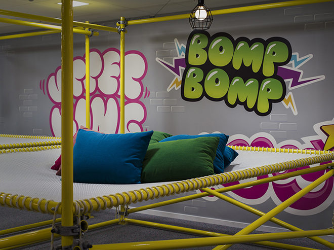 Adolfsson & Partners qui s’est occupé du design intérieur s’est certes inspiré de Candy Crush mais également des 200 autres jeux de King. Résultat : des murs recouverts de dessins de monstres, des espaces de jeu, des balançoires, des lits trampolines, etc. Regardez :