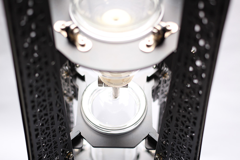 Il suffit de trois flacons alignés verticalement et de la force de gravité pour permettre à l’eau de les traverser et devenir du café. Le parcours de l’eau débute dans le flacon du haut puis est filtrée vers le bas dans le flacon contenant le café moulu pour arriver enfin sous forme de café dans le dernier flacon. Dutch Lab préconise de débuter le processus dans la nuit afin que votre café soit prêt au petit matin.