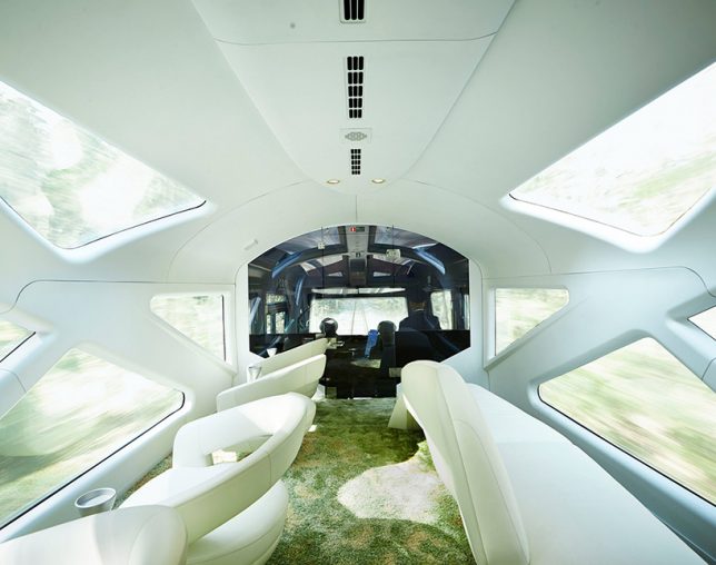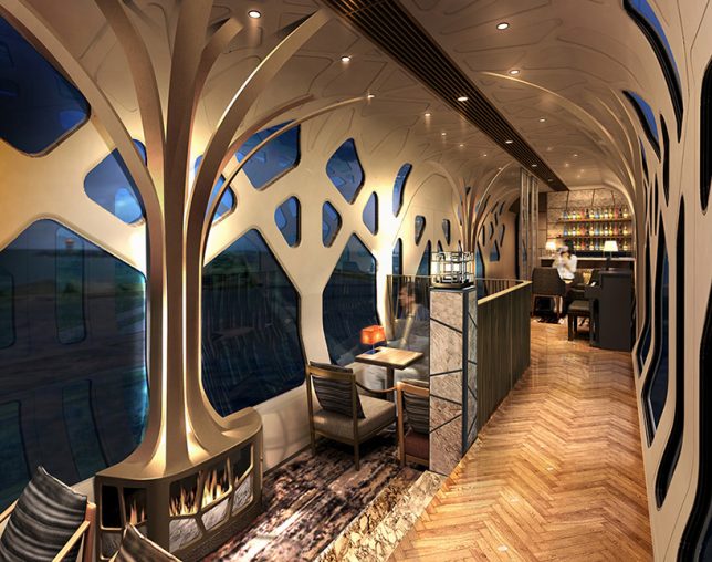 Mais revenons-en à notre train de luxe. À l’intérieur, les cadres de fenêtres à ramification ont été imaginés pour évoquer et suggérer des forêts bordées d’arbres. Les géométries de la fenêtre à l’extérieur reflètent les différents besoins des espaces intérieurs ; les salles communes, les salles de restaurant et les compartiments couchette à deux niveaux. Rien n’a été laissé au hasard, le moindre matériau a été choisi avec soin pour offrir le maximum de confort aux passagers, quel que soit le compartiment où ils se trouvent.