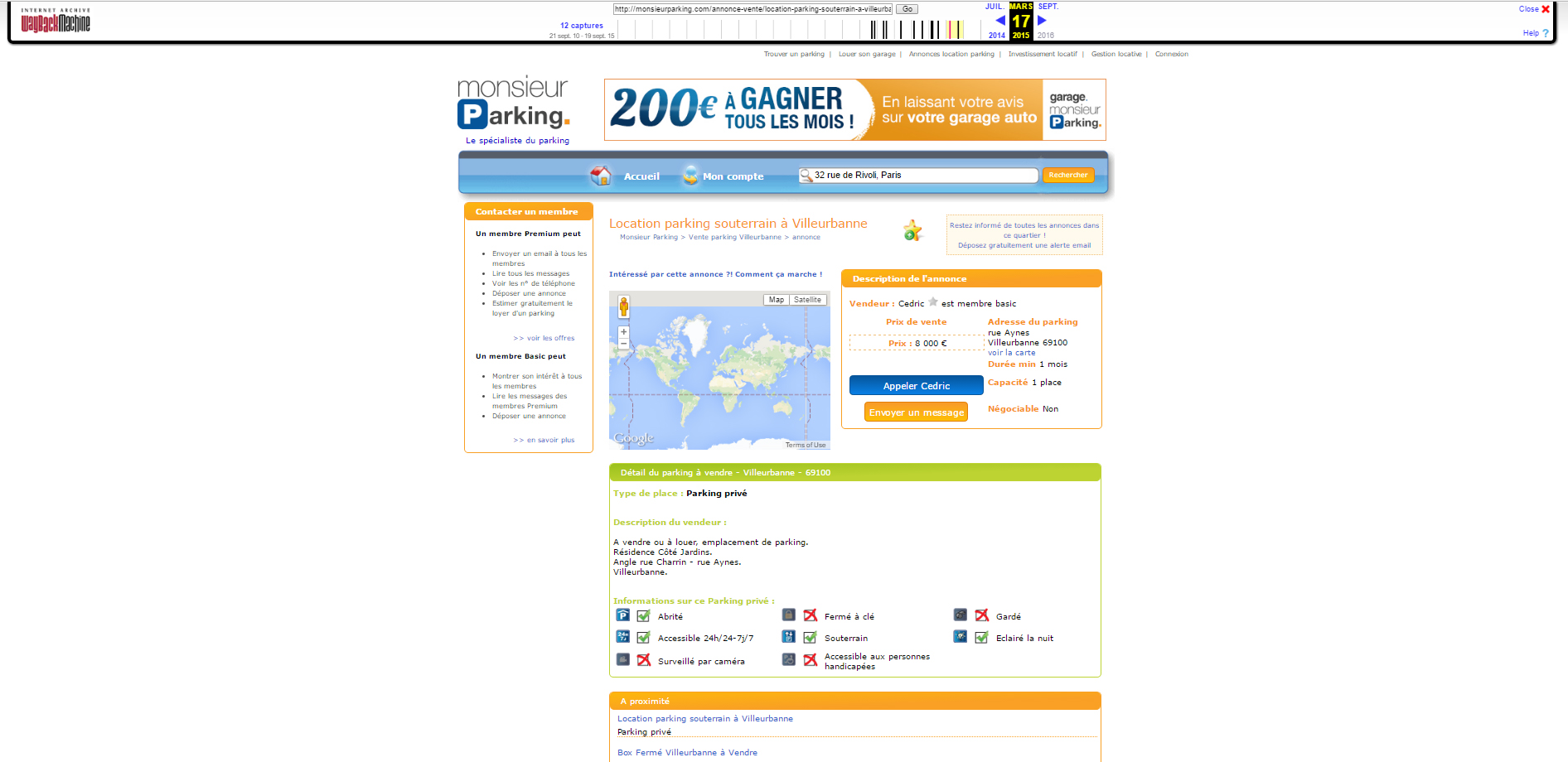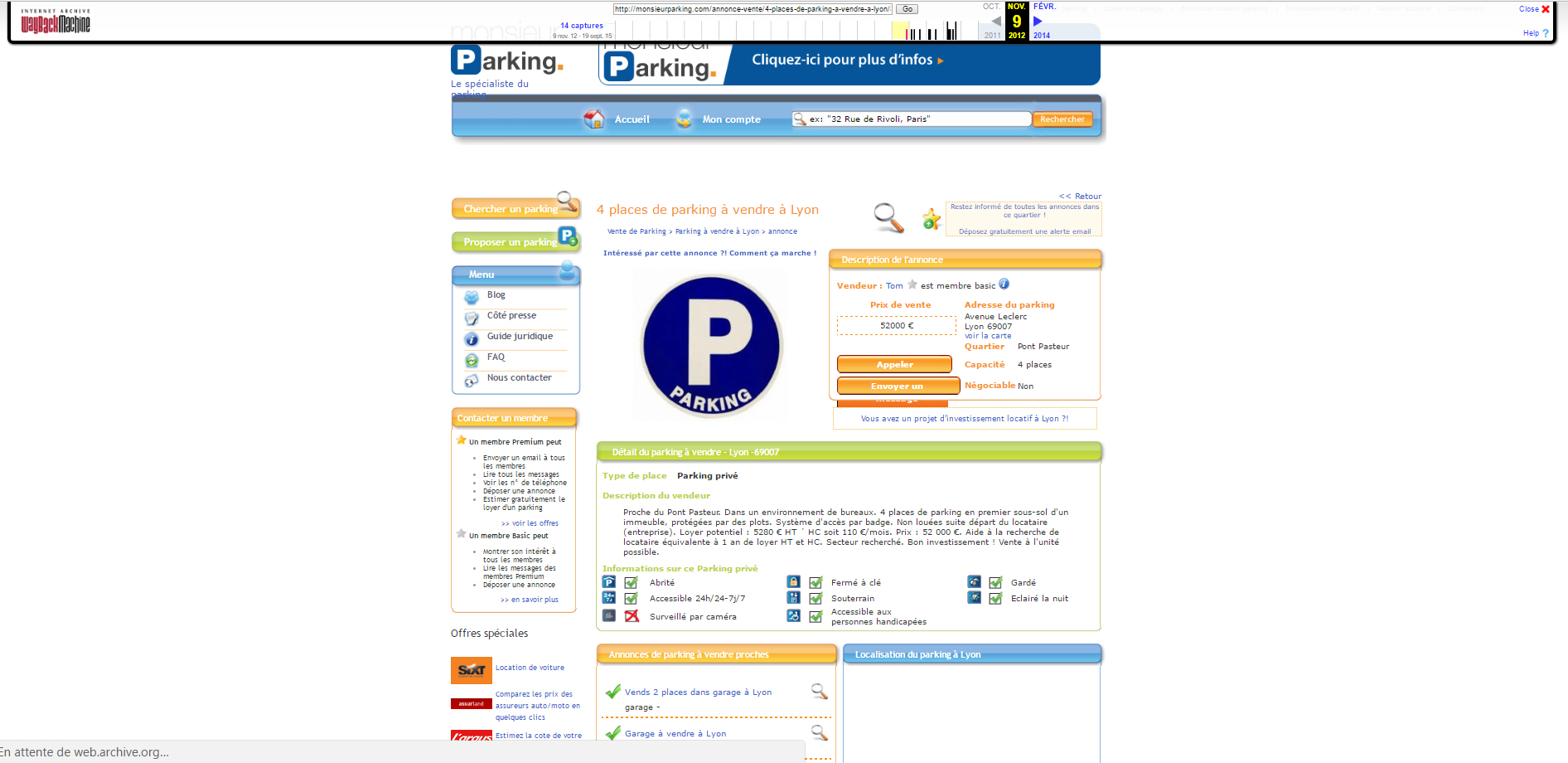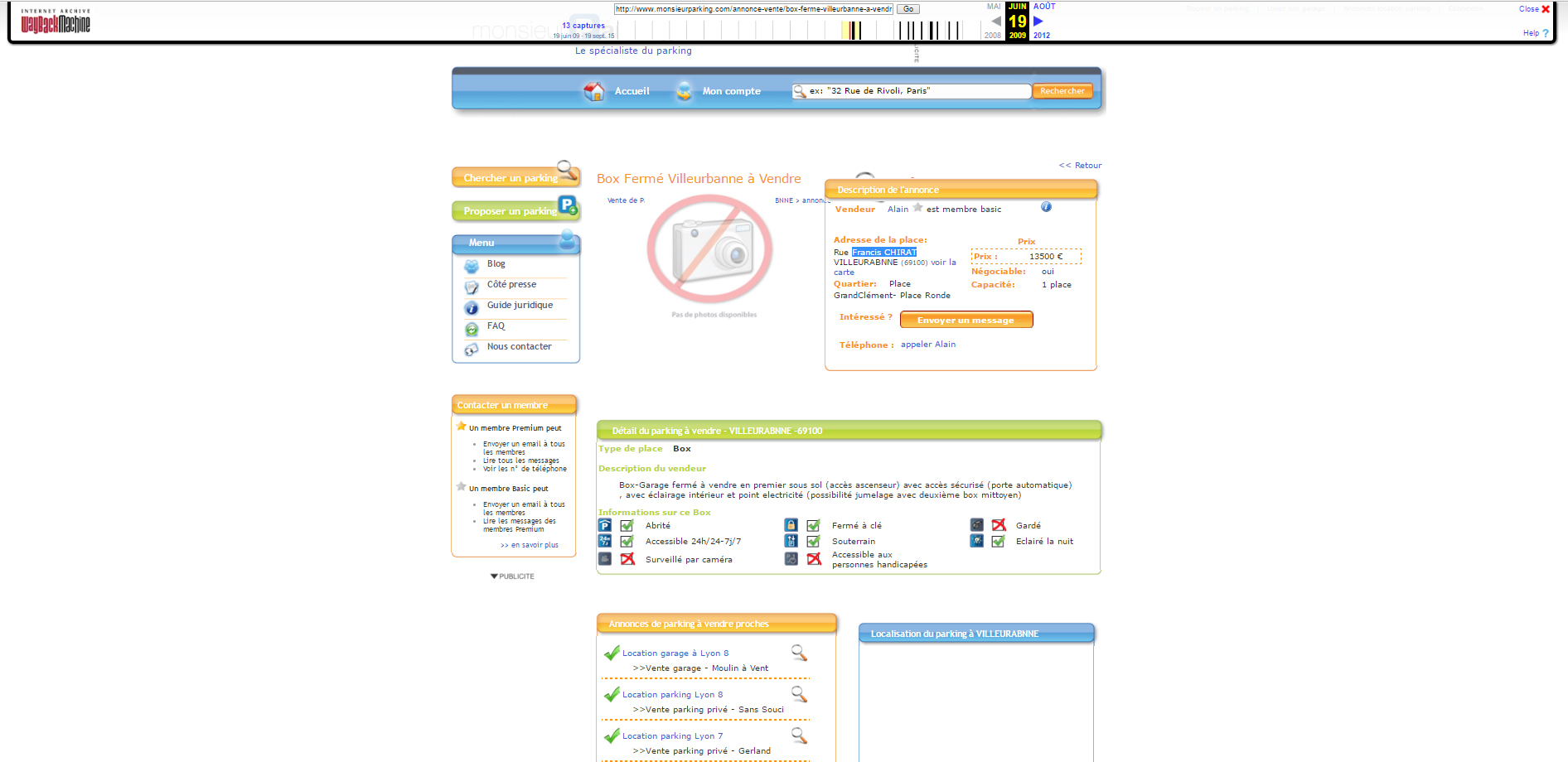 Nous ne sommes pas d’accord sur la date. Comment suis-je arrivé à la conclusion que cette annonce était en ligne au moins depuis Mars 2009 ? Tout simplement en utilisant le service WayBackMachine du site Archive.org. Ce service permet de connaitre toutes les modifications apportées à une url donnée (dans mon cas l’url est : monsieurparking.com/annonce-vente/garage-souterrain-a-vendre-a-lyon-3/25358.html)