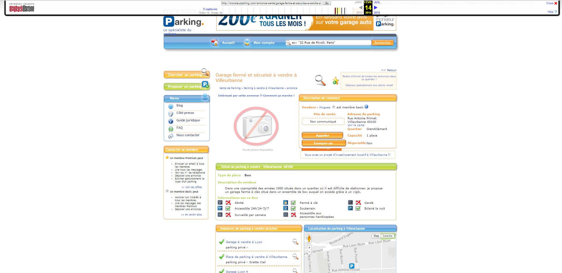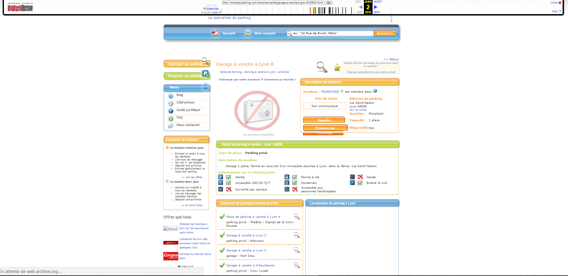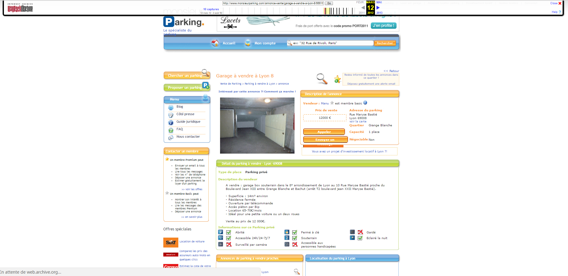 Nous ne sommes pas d’accord sur la date. Comment suis-je arrivé à la conclusion que cette annonce était en ligne au moins depuis Mars 2009 ? Tout simplement en utilisant le service WayBackMachine du site Archive.org. Ce service permet de connaitre toutes les modifications apportées à une url donnée (dans mon cas l’url est : monsieurparking.com/annonce-vente/garage-souterrain-a-vendre-a-lyon-3/25358.html)