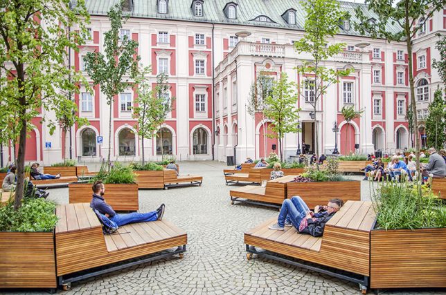 Installée devant la mairie de Poznan en Pologne, cette oasis urbaine est composée de sièges et de verdure ; le tout monté sur des roulettes afin de pouvoir redéfinir l’espace à l’infini. Le mot d’ordre est : flexibilité.