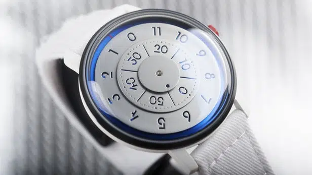 Le tout est scellé dans un boîtier de 42 mm en acier inoxydable 316L avec un revêtement en céramique Cerakote blanc et est étanche à 50 m. Les cristaux avant et inversés sont en plexiglas avec traitement antireflet en saphir et la montre est protégée par des courroies en tissu blanc portant le logo de la NASA brodé utilisé par l’agence spatiale entre 1975 et 1992. Enfin, le bracelet arbore les coordonnées du centre spatial Kennedy en Floride.