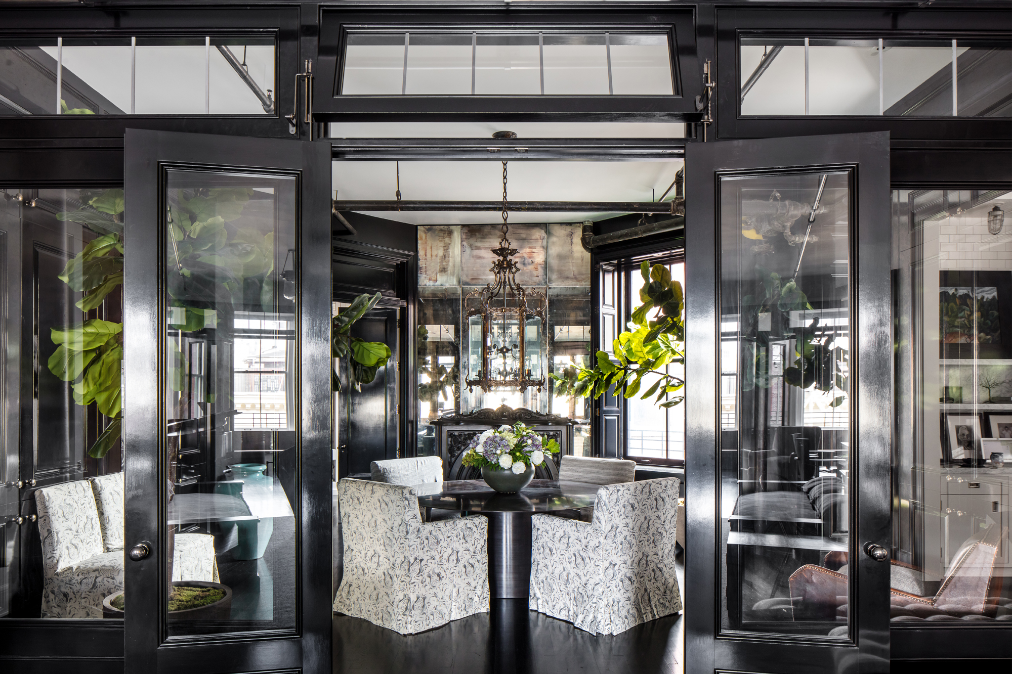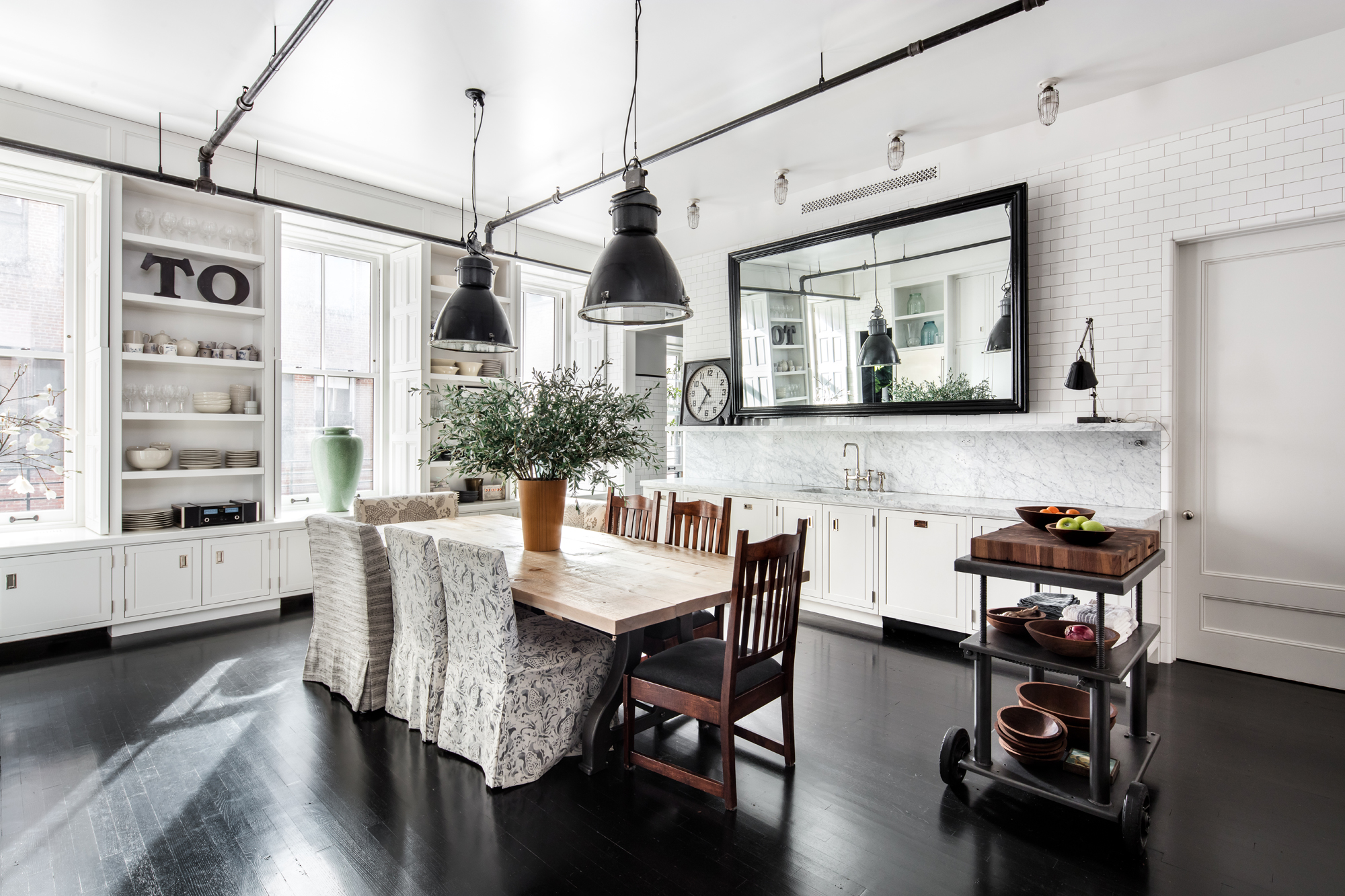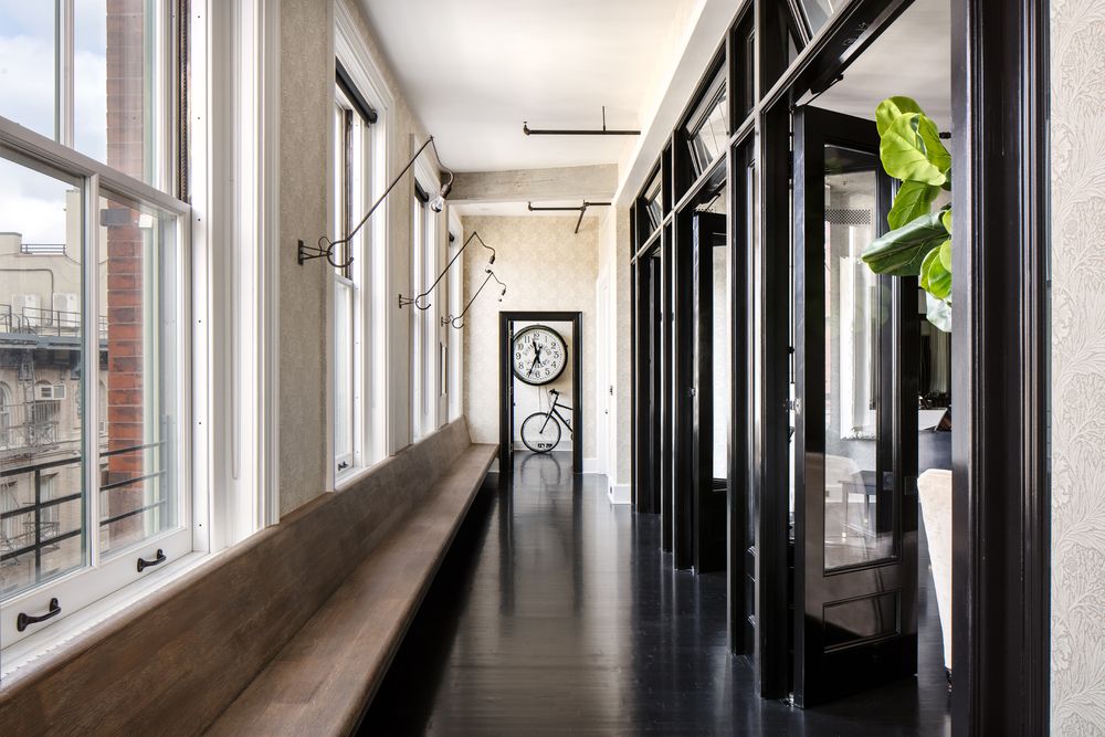 Cet appartement est un loft classique à la disposition fluide mais funky. L’ascenseur de l’immeuble dessert directement un grand hall d’entrée orné de cinq fenêtres donnant sur la rue Mercer d’un côté et un ensemble de portes noires brillantes qui mènent dans le salon de l’autre. Une salle à manger formelle séparée avec une cheminée décorative marbrée mène ensuite au salon.
