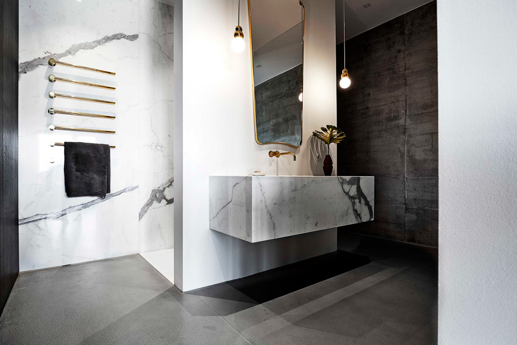 A l’intérieur vous pourrez découvrir des murs en bétons complétés par des matériaux comme le bronze, le bois ou le marbre. Autre petit détail que j’aime beaucoup : un mur de verre Crittall qui sépare la chambre des espaces de vie décloisonnés. Le tout étant décoré avec des pièces de design de Arne Jacobsen, Eero Saarinen, Cassina et Bulthaup pour la cuisine.