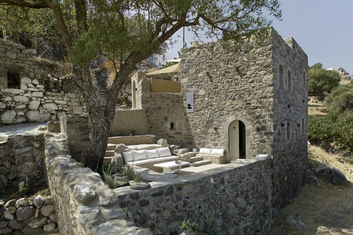 Melanopetra est installée à une altitude d’environ 400 mètres au-dessus de la caldeira. Il s’agit d’une villa en pierre de deux étages, construite autour de 1850 et totalement restaurée en 2015 tout en respectant son architecture nisyrienne.