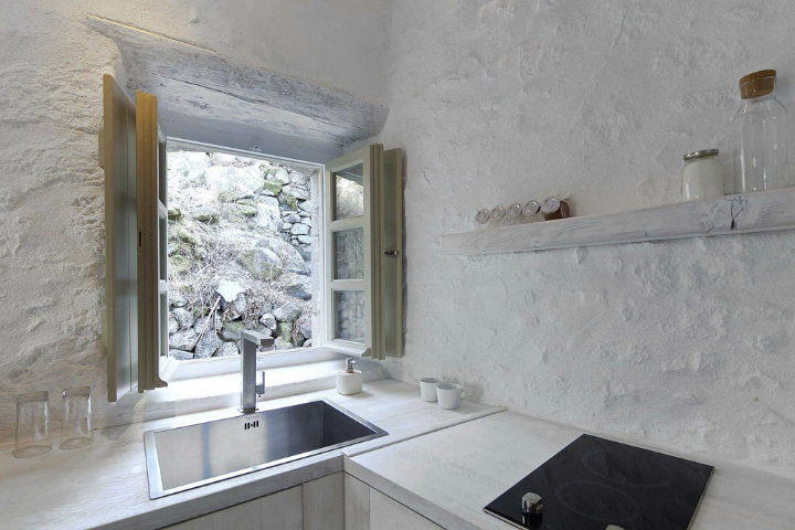 Les couleurs terreuses et les nuances de blanc sont combinées avec des touches soignées de tissus en lin et en coton et des éléments traditionnels conservés. La lumière naturelle qui entre à travers les petites fenêtres apporte de la texture à ces grands espaces blancs et crée une ambiance harmonieuse, voir presque magique. Dans la salle de bains, il est possible d’entendre l’eau s’écouler dans la citerne souterraine conservée à l’identique et utilisée pour la collecte de l’eau de pluie provenant du toit.