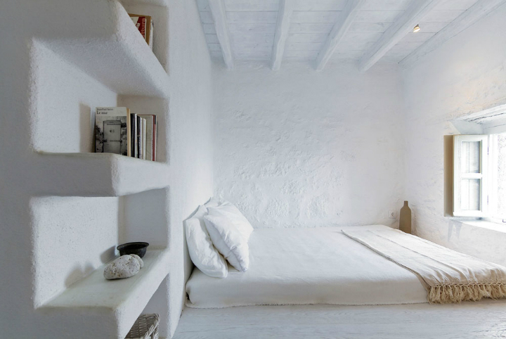 L’idée du projet est né de l’imagination de sa propriétaire et architecte, Anna Apostolou. La somptueuse villa est composée de deux appartements de luxe ; un à chaque étage. Les intérieurs minimalistes blancs avec des bords lisses incurvés, les surfaces texturées rugueuses et la décoration simple offrent une atmosphère de détente pour des vacances réussies.