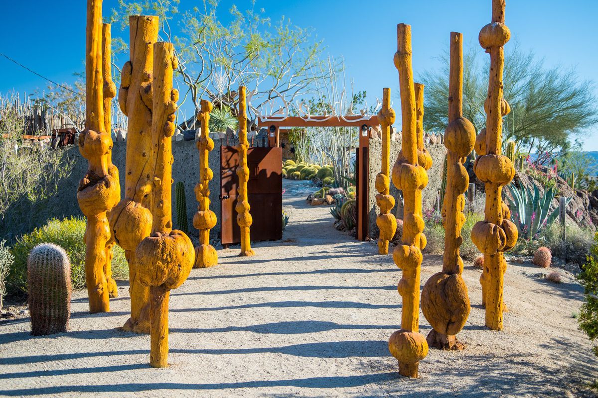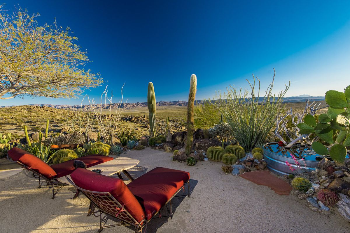 L’aménagement paysager (et du reste de la propriété) a été imaginé et réalisé par ses propriétaires actuels, Gino Dreese et Troy Williams. Les deux hommes ont transformé l’espace durant deux décennies. Vingt années durant lesquelles ils ont voyagé à travers le monde et ont ramené des rochers, des pierres colorées et des végétaux afin de construire la maison de leur rêve.